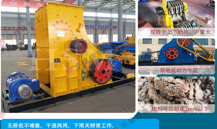 雙級錘式破碎機也稱雙級錘式制砂機,雙轉子錘式細碎機,內無篩網、不留余渣、物料干、濕度不限,進料粒度不限,不管任何形狀的煤泥,可直接進機粉碎。雙轉子上下兩級粉碎,互相串連的兩套轉子,使經上級轉子擊碎物料即被飛速旋轉的下級轉子的錘頭再次細碎,腔物料相互飛速碰撞,相互粉碎,達到錘粉料、料粉料效果,出料粒度小于3毫米,適用于方解石、石灰巖、爐渣、礦渣等物料。設計了移位調隙技術,當錘頭磨損后不需修復,移動位置反復使用,通常一副錘頭可頂多副使用。